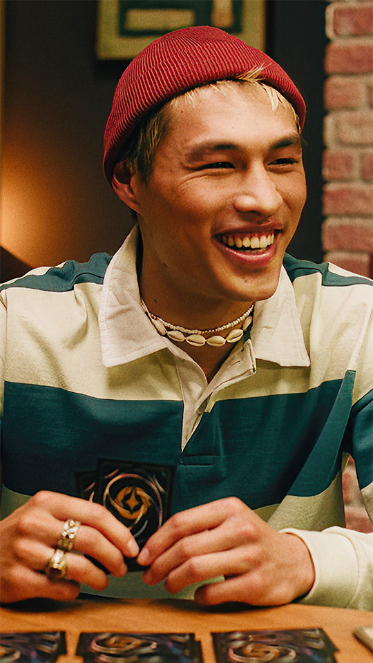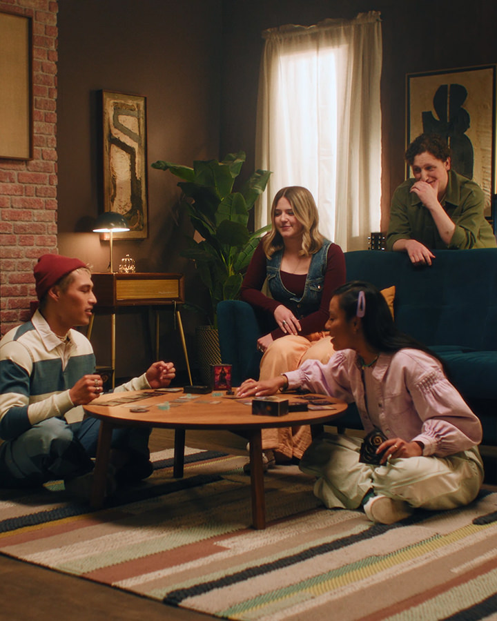 This is about real fans, players, and collectors of Lorcana getting together to enjoy the game they love. That was the ultimate directive for the decisions we made on set and off. We chose to shoot in casual scenarios: friends gathered around a table, hanging out, playing Lorcana together. We wanted our cast to express their personal style (and maybe their fandom) through their wardrobe. We wanted pops of color in our clothes and our set dressing to bring the vibrancy of the brand to life, and also allude to classic Disney characters from Ariel to Smee.